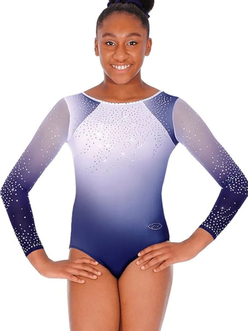 The zone navy og hvid meget flot gymnastikdragt til piger. Masser af flotte farvede rhinsten på front, ryg og de lange mesh ærmer