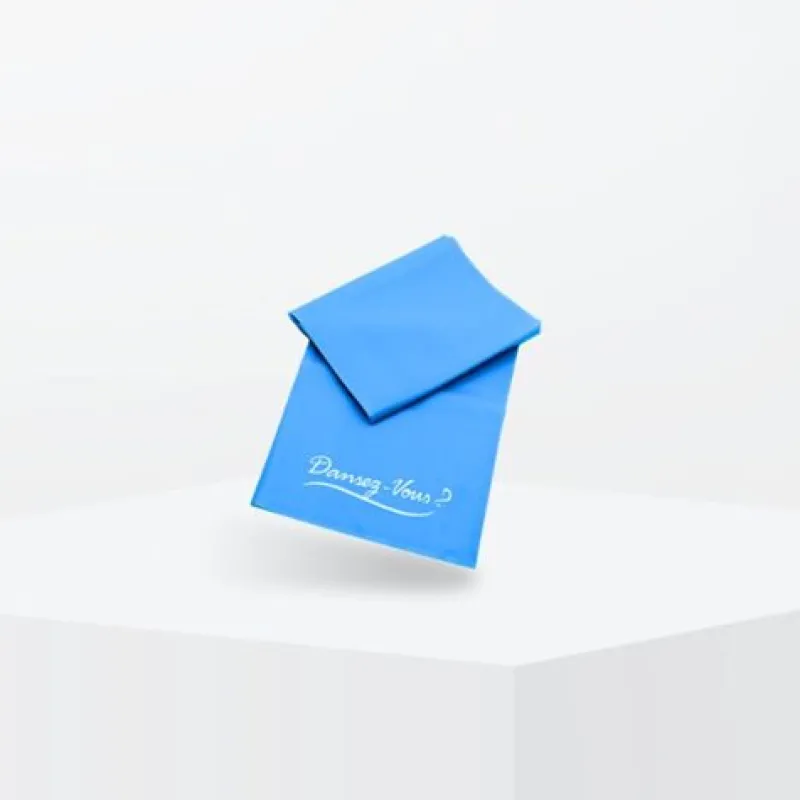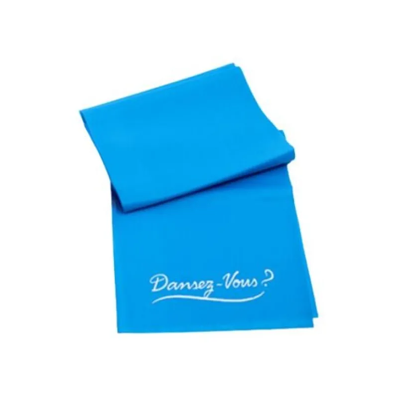 Træningselastik i blå – Medium styrke fra Dansez-Vous. Perfekt til ballet og styrkelse af fødder før brug af tåspidsko. Fremmer styrke og fleksibilitet. Let og transportabel, måler 146,7 x 15 cm. Ideel til træning overalt.