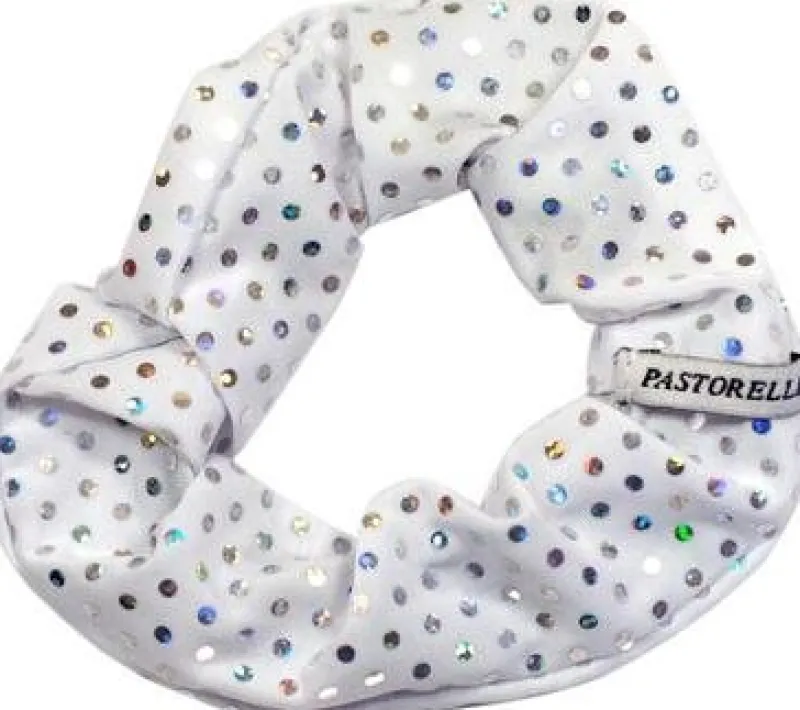 Hvid scrunchie med trykte palietter til gymnastik og dans. Flot hårpynt.