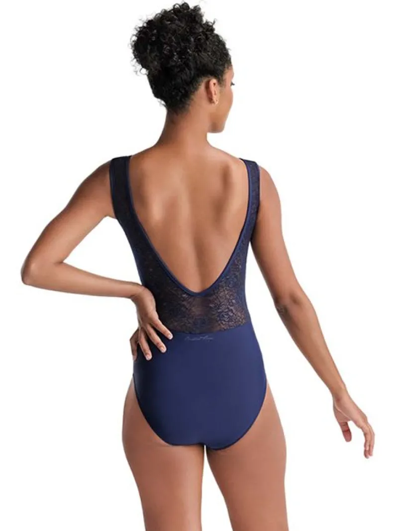 Mørkeblå balletdragt fra BalletRosa med flot blonde detalje på ryggen.