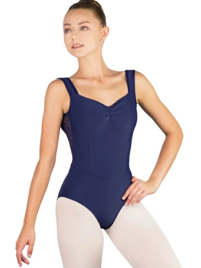 Mørkeblå balletdragt fra BalletRosa med flot blonde detalje på ryggen.Balletdragten har brede stropper, rynkedetalje …