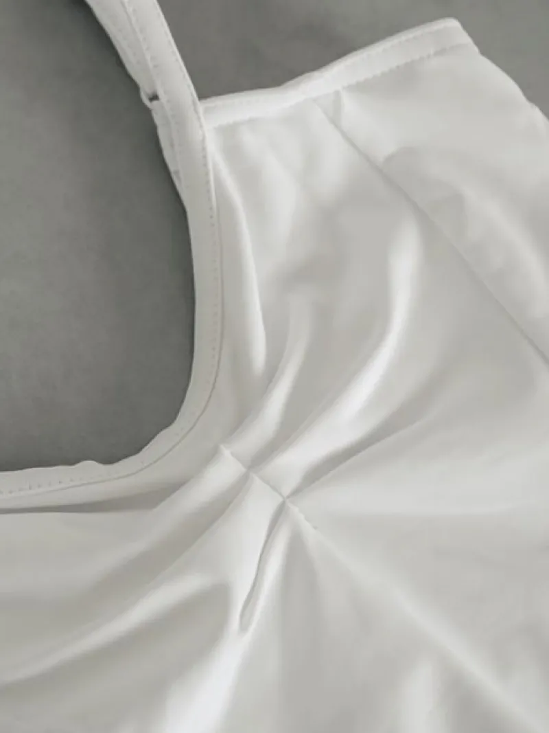 Elegant hvid dragt med prinsesse sømme og tynde justerbare stropper. Flot v- ryg og rynkedetalje både foran og bagpå.