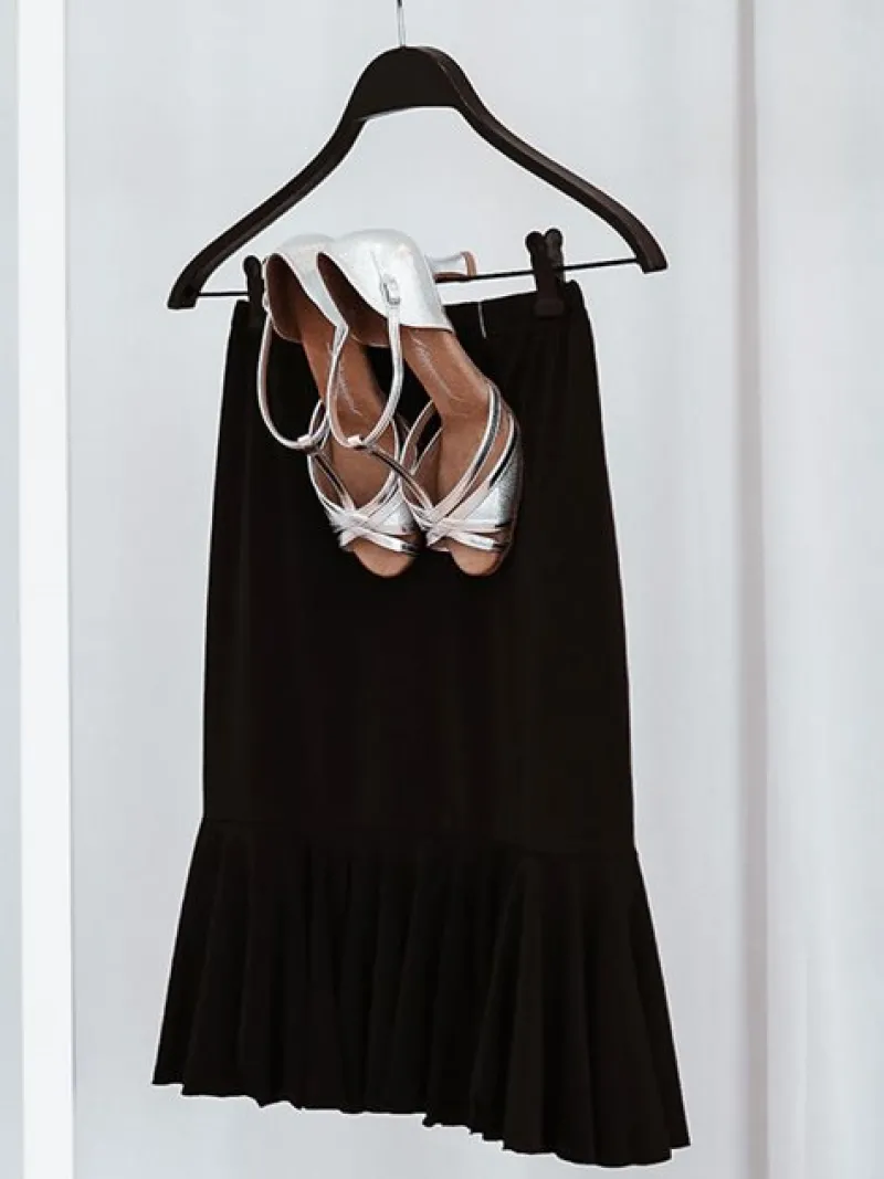 Denne sorte nederdel med flæsestykker forneden er perfekt til enhver dansestil. Med sin smalle elastik i taljen og høje kvalitet, bevarer den både form og farve. En yderst populær nederdel til swing, salsa, argentinsk tango og latin. Dans med stil og komfort.